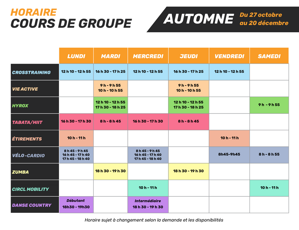 L’enseignement des cours est donné par des professionnels et entraîneurs passionnés qui seront vous motiver à dépasser vos limites. Atteignez vos objectifs dans un atmosphère d’entraînement stimulant et accueillant ! Inscription personnalisée et modifiable jusqu’à 24 heures à l’avance sur notre implication web.
